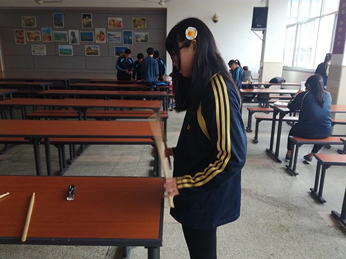 刚踏上楼梯,便听到了屋内传来的阵阵鼓声,让我们不禁疑惑:还没到上课时间,怎么已经开始训练了呢?而走进教室才发现,原来是同学们在等待老师的间隙,先自行练习了起来。