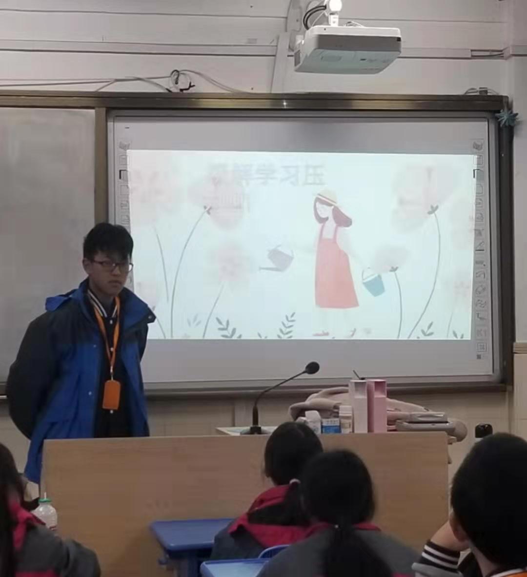 在他的演讲内容中,有心理压力从何而来,也有如何以恰当的方式缓解心情。为了让我们更好的理解,心理委员还与我们班主任老师一起做了个小游戏,