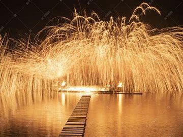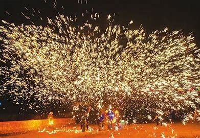 打铁花的表演形式独特且极具观赏性。表演前,需在空旷场地搭建六米高的双层花棚,棚上密布新鲜柳枝,并绑满烟花鞭炮等。表演时,打花者头戴反扣的葫芦瓢,赤裸上身,手持盛有铁汁的上棒和未盛铁汁的下棒,迅速跑至花棚下,用下棒猛击上棒,使铁水冲向花棚,铁水遇棚顶柳枝迸溅四射,形成十几米高的铁花,同时点燃棚上的鞭炮、烟花,场面极为壮观。