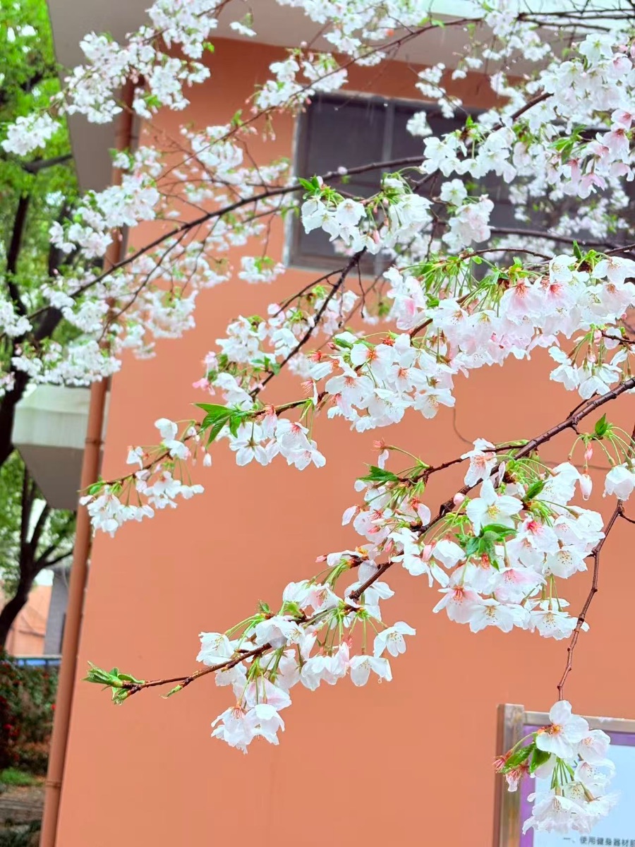 远远望过去,只是一团粉白的云,朦朦胧胧地浮在枝头。可走到树下抬头看,每一朵都精致得像小小的工艺品——五片花瓣薄薄的,边缘带着细碎的缺口,颜色从花瓣根部淡淡的粉,慢慢过渡到边缘近乎透明的白,像是谁用清水仔细晕染过的。